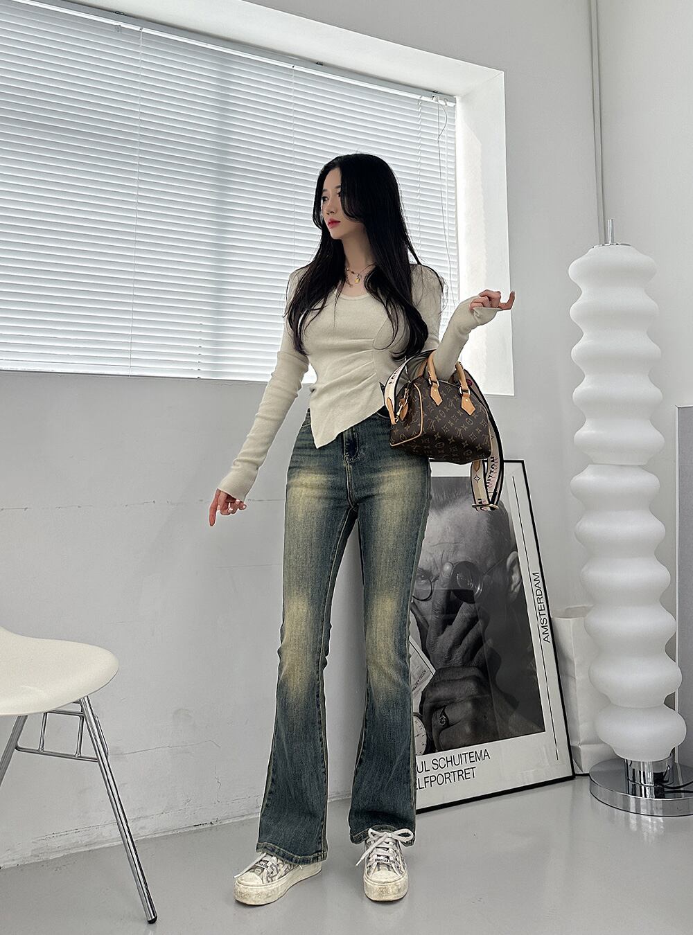 このデニムは全体的なシルエットをよく整えてくれるので