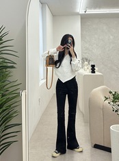 膝下から長く広がるスリムブーツカットの定番のようなパンツ···❤
